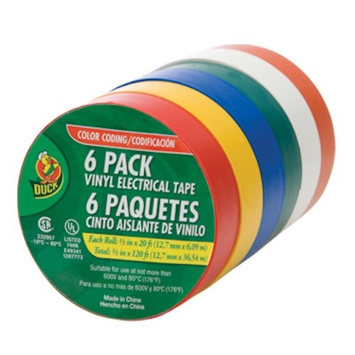 Duck Brand 1287773, Duck brand offers a variety of electrical tape products, including professional, high performance and utility grade tapes for basic and professional electrical repair needs. This is six rolls of Duck Brand Vinyl Electrical Tape, 7 mi vinyl tape in 6 different colors, red, yellow, blue, green, white and orange Each roll is .5-Inch wide by 20-Feet long. Tape is flame retardant and weather-resistant. Rated for use up to 600 volts and between 14 and 175-Degrees Fahrenheit. Provides excellent stretch, adhesion, and conformability. UL listed and CSA certified. Whether you are an electrical professional or a Saturday home handyman, Duck makes the right electrical tape for your needs.
